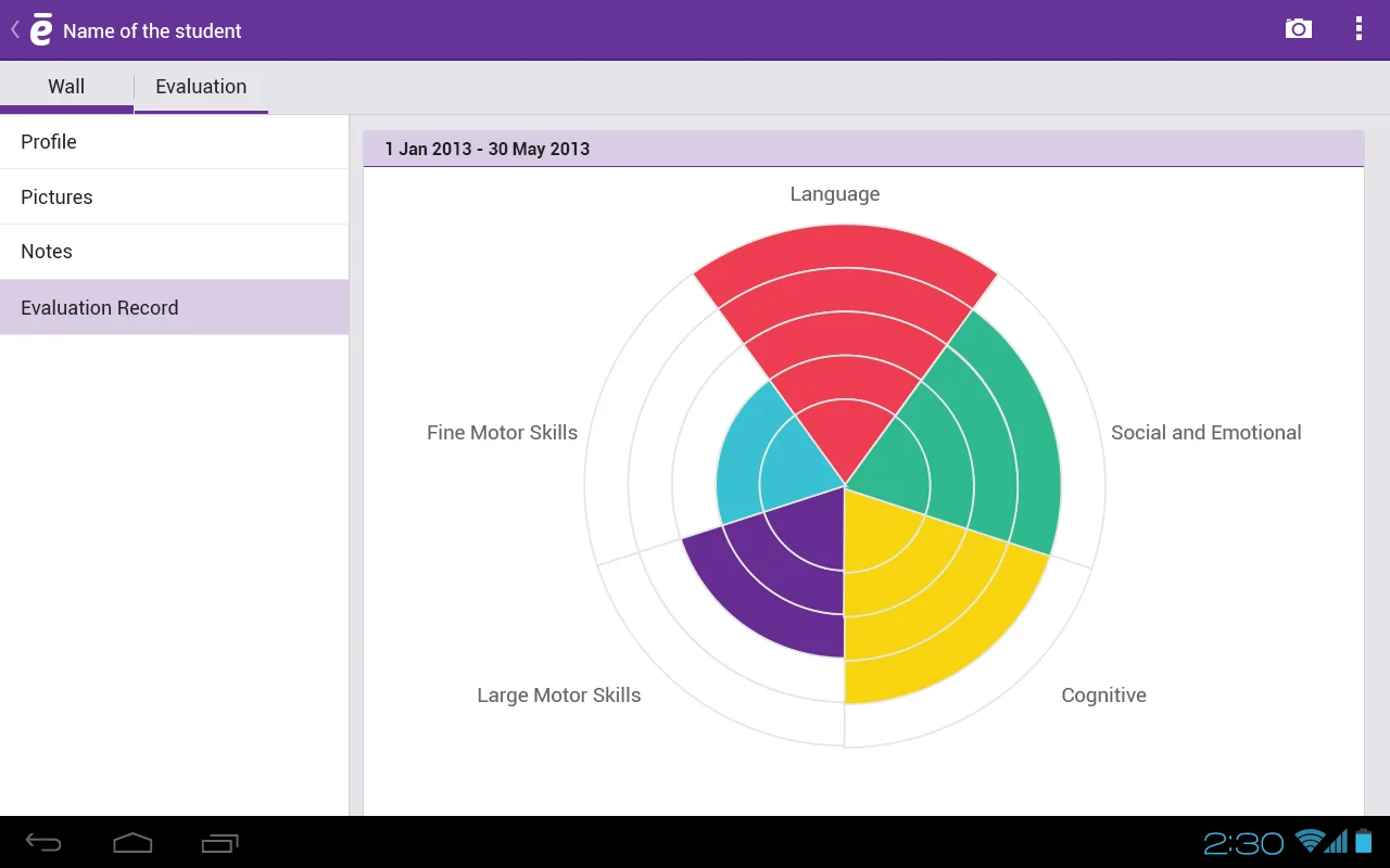 The evaluation criteria is based on developmental milestones, with non competitive and positive ratings (unlike A, B, C, D). Based on users, the data is represented in various different views. For example, the head master/mistress can compare all class progress to evaluate teachers. The teacher can compare all their students for a self evaluation. The teacher can even compare an individual students evaluation to communicate to parents.